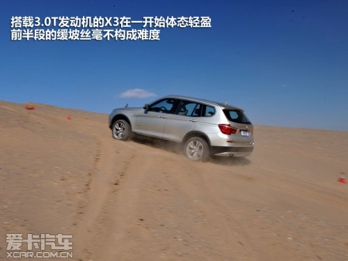 或許是奧迪Q5完成測(cè)試的過程比較順利,我們對(duì)接下來即將登場(chǎng)的寶馬X3也普遍比較看好,這或許就是思維慣性帶來的固定套路吧。然而在實(shí)地測(cè)試過程中,這臺(tái)X3攀爬沙丘的過程卻沒有表現(xiàn)出它在公路上所煥發(fā)出的霸氣。400?!っ椎淖畲笈ぞ卦诔鞘械缆分校踔猎诟咚俟飞隙际菬o與倫比的,但移步至眼前狂風(fēng)大作的沙丘,這400牛·米的扭矩則像是心有余而力不足的悲情英雄。