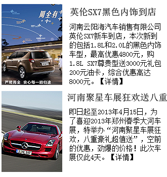 導語映象網(wǎng)汽車頻道,為了給廣大愛車人士提供更多的車市信息,創(chuàng)辦了車市行情欄目,欄目提供中原車市各大4S店的打折信息、活動等信息,為您購車、選車、試車做向?qū)А?/FONT>