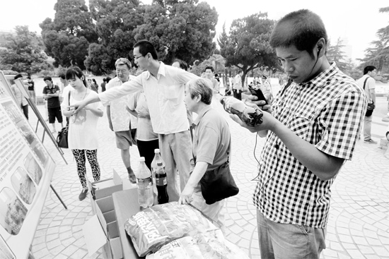 昨天上午,紫荊廣場(chǎng),在公安機(jī)關(guān)繳獲的假飲料、糖貨展臺(tái)前,不少市民拿著假冒的可樂(lè)翻來(lái)覆去地看,想找出破綻。