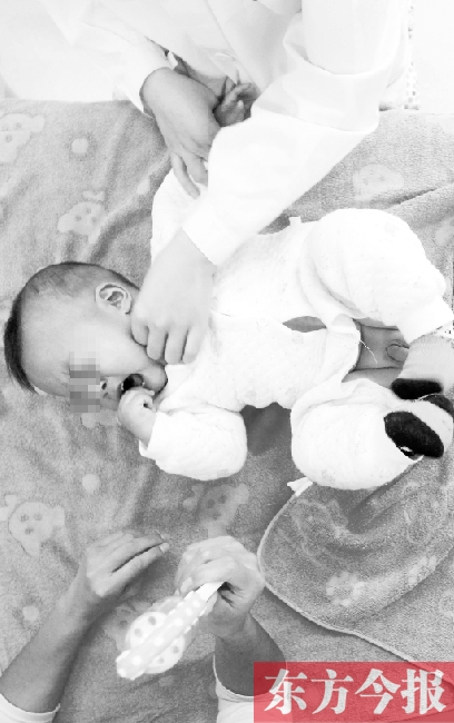 門口還有一名女子在給幼兒做推拿,過程大致相同,有多位家長抱著幼兒在排隊等候。