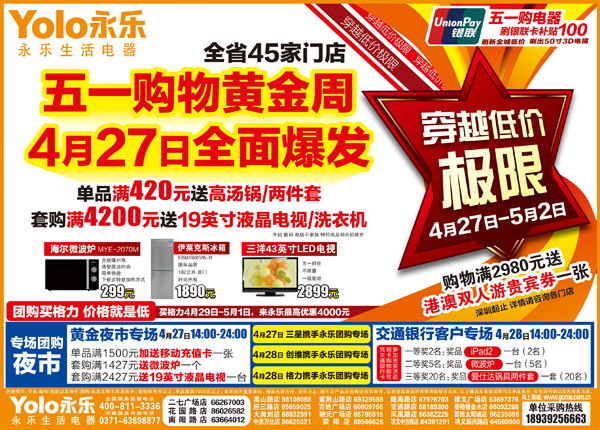 據(jù)悉,今年五一,永樂電器向中外800多家電器廠家拋出30億規(guī)模的采購大單。借助于30億大單的規(guī)模優(yōu)勢,永樂將于4月27日發(fā)起五一黃金周降價潮,其中,彩電產(chǎn)品全場7折起,50英寸3D彩電價格更是首次降價幅度超過25%,合資品牌46英寸LED網(wǎng)絡(luò)電視跌破7000元,合資品牌三洋32英寸液晶電視僅售1699元;空調(diào)方面,格力、美的、海爾、志高、伊萊克斯、TCL、三洋等知名空調(diào)廠商的2012主打產(chǎn)品五一期間全部上陣永樂各大賣場,舉行大型特賣活動,使空調(diào)價格下降25%左右。1匹空調(diào)永樂五一最低降至2000元以下,而且不限量供應(yīng),更驚爆的還有一款1.5P的空調(diào)僅售價1999元,且大量供應(yīng)100臺;洗衣機(jī)價格平均降幅達(dá)30%,冰箱產(chǎn)品平均降幅也在30%以上,對開門冰箱首度跌破3500元。此外,廚衛(wèi)產(chǎn)品也將出現(xiàn)全年最大幅度的讓利優(yōu)惠,煙灶、熱水器等產(chǎn)品將以直降為主,購買套餐組合優(yōu)惠力度更大,方太經(jīng)典歐式煙灶套餐僅3700元左右,華帝廚衛(wèi)全場5折起,伊萊克斯電熱水器驚爆價999元;暢銷小家電也將大幅優(yōu)惠讓利。3C產(chǎn)品優(yōu)惠力度更大。其中HTC、索尼愛立信、諾基亞等品牌新品、暢銷品超低價銷售,千元智能手機(jī)大量供應(yīng);數(shù)碼產(chǎn)品方面,佳能、索尼、尼康、奧林巴斯、三星等品牌全面低價讓利,降價幅度高達(dá)20%。1200萬數(shù)碼相機(jī)跌破700元。最熱門的佳能600D單反數(shù)碼僅售5287元另加送多重禮品;同時,電腦產(chǎn)品也有不同程度的優(yōu)惠,戴爾2G內(nèi)存、500G硬盤、雙核處理器、獨(dú)立顯卡的筆記本電腦永樂專享價僅2999元。