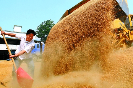 6月12日,息縣彭店鄉(xiāng)張莊村種糧大戶柳學(xué)友正在翻曬麥子。他今年種了2600畝小麥,通過精心管理,平均畝產(chǎn)達(dá)450公斤以上。記者 王天定 攝