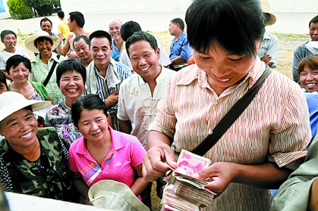 6月26日,在省糧油對(duì)外貿(mào)易有限公司郾城糧食儲(chǔ)備庫,前來賣糧的農(nóng)民高興地?cái)?shù)著手中的鈔票。