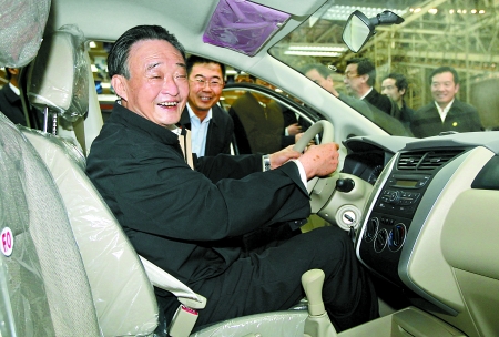 4月13日,中共中央政治局常委、全國(guó)人大常委會(huì)委員長(zhǎng)吳邦國(guó)在東風(fēng)日產(chǎn)(鄭州)有限公司考察工作。圖為吳邦國(guó)委員長(zhǎng)坐上一輛銀色樣車,查看車內(nèi)配置情況。 河南日?qǐng)?bào)記者 郭 宇 李建峰 攝