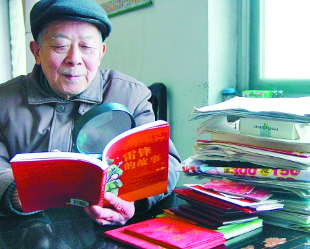 黃先知老人眼睛雖花了,仍每天堅(jiān)持借助放大鏡閱讀已看了無(wú)數(shù)遍的《雷鋒的故事》。