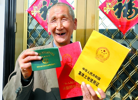 4月6日,舞鋼市尹集鎮(zhèn)張莊新型農(nóng)村社區(qū)農(nóng)民邱建功領(lǐng)到房屋所有權(quán)證和集體土地使用證后喜笑顏開。