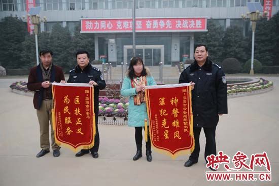 映象網(wǎng)訊(記者 王文凱 通訊員 牛智瑞 薛勇)滎陽17歲男孩盧健(化名)在被困傳銷窩點21天后,滎陽警方跨省將其營救。20日上午8時許,心存感激的孩子父母及親屬敲鑼打鼓來到滎陽市公安局,把“匡扶正義,為民服務”“神警雄風,罪犯克星”,兩面錦旗贈給公安局,局長夏日紅和政治部主任楚宏偉親自從家屬手中接過兩面錦旗。無法表達內(nèi)心感激之情的盧女士拿出兩萬元現(xiàn)金要對專案組民警表示謝意,遭到夏日紅局長拒絕。