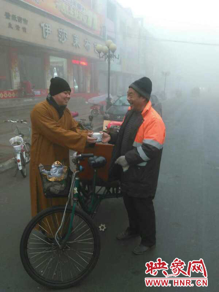 僧人名叫釋妙亮,是滎陽市豫龍鎮(zhèn)興國寺法師。他說,早上6天他們出發(fā)了,截止早上7時30分,他們已經(jīng)免費(fèi)送了三桶臘八粥。