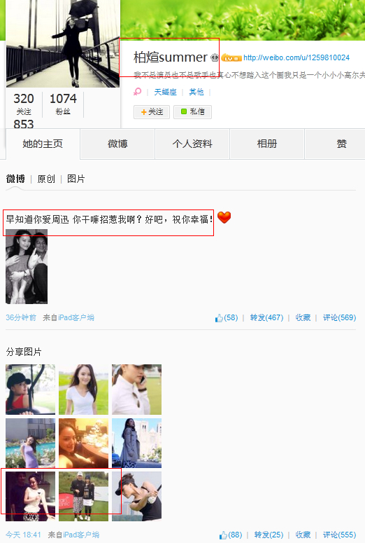 該微博也引起了不少熱心網(wǎng)友的注意,微博@麻辣婊哥懷疑@柏煊summer在刻意炒作,微博稱:“@柏煊summer 在周迅公布和高圣遠(yuǎn)的戀情后模仿發(fā)布微博,之后稱是朋友,居心叵測(cè),個(gè)人簡(jiǎn)介換得挺快的,不過(guò)得到關(guān)注已經(jīng)目的達(dá)到。不過(guò)話說(shuō)回來(lái),摟腰與共臥的行為也太過(guò)親密,絕非一般朋友,但周公子閱男無(wú)數(shù),此女威脅指數(shù)幾乎為零。 ”