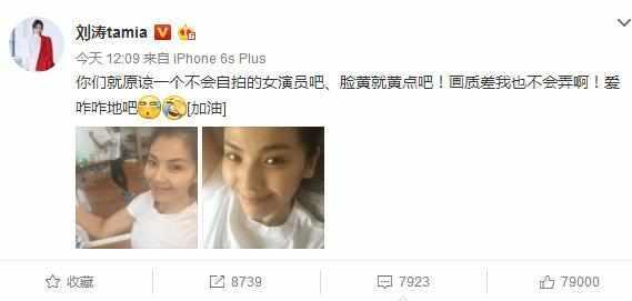 近期,劉濤在微博上面曬出了兩張照片,附文“你們就原諒一個(gè)不會(huì)自拍的女演員吧、臉黃就黃點(diǎn)吧!畫(huà)質(zhì)差我也不會(huì)弄??!愛(ài)咋咋地吧”!
