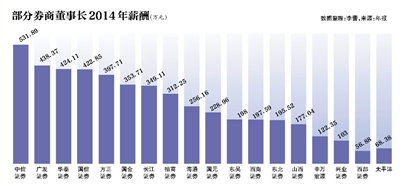 就券商董事長薪酬來看,2014年薪酬超過400萬的包括中信證券董事長王東明,薪酬為531萬元;廣發(fā)證券董事長孫樹明438萬元;華泰證券董事長吳萬善424萬元;國信證券董事長何如423萬元。