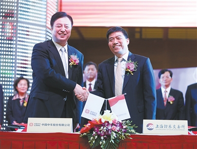 6月8日,中國中車股份有限公司副董事長劉化龍(左)與上海證券交易所副總經(jīng)理徐明簽訂《上市協(xié)議書》。當日,中國中車在上交所鳴鑼上市。