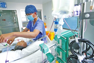 河南省人民醫(yī)院重癥監(jiān)護室內,“護士先生”王光昆守護在一位危重病人的床前。