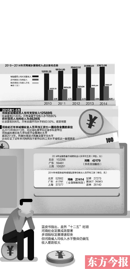 藍(lán)皮書指出,雖然“十二五”時(shí)期河南社會(huì)發(fā)展成效顯著,多項(xiàng)指標(biāo)發(fā)展增速較快,但河南省人均收入水平整體仍偏低,收入差距較大。□東方今報(bào)首席記者 李凌全省經(jīng)濟(jì)發(fā)展并不平衡。豫北豫西發(fā)展較快,豫東豫南發(fā)展較慢,但是在收入分配領(lǐng)域中,全省18個(gè)省轄市之間收入水平雖然存在著不小的差距,但并不與經(jīng)濟(jì)發(fā)展同步。