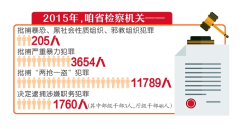 去年,我省檢察機(jī)關(guān)決定逮捕涉嫌職務(wù)犯罪1760人,其中部級干部3人,廳級干部48人。此外,在打擊非法集資、促進(jìn)依法行政、規(guī)范司法方面也取得成效。