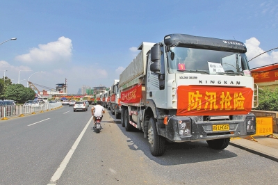 昨天,武漢市江漢區(qū)沿江大道,一排排渣土車滿載渣土,??吭诼愤?。長(zhǎng)江北岸的堤壩上,到處張貼著“人在堤在”、“誓死保衛(wèi)大武漢”等宣傳標(biāo)語(yǔ)。