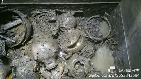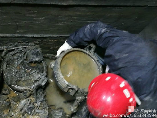據(jù)@河南考古 微博消息,近日在河南一座古墓發(fā)掘現(xiàn)場,出土了幾只裝有“肉湯”大鼎,。