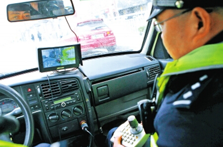 警車上配備的車載動態(tài)取證系統(tǒng),在巡邏的同時可對道路上的交通違法行為進(jìn)行攝錄取證。記者白周峰攝影