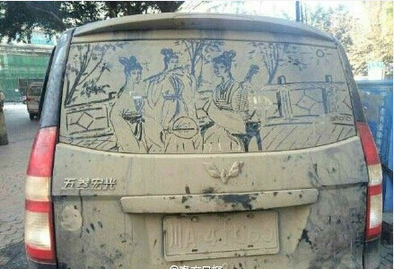 網(wǎng)友在成都偶遇一臟不溜秋的面包車!走近一看,后檔風(fēng)玻璃上畫了一副美女圖,惟妙惟肖!~你只覺得我沒錢洗車,卻不知道我也有一顆藝術(shù)的心~~只是朋友,車牌被擋住了,等會(huì)兒警察蜀黍過來……