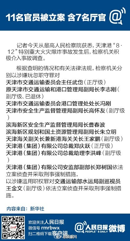 天津交通委主任武岱(正廳)、原天津交通運輸和港口管理局副局長李志剛(副廳、已退休)、天津安監(jiān)局副局長高懷友(副廳)、天津海關副關長王家鵬(副廳)、天津港集團總裁鄭慶躍(正廳)、總裁助理李洪峰(副廳)、交通部水運局副巡視員王金文(副廳)。