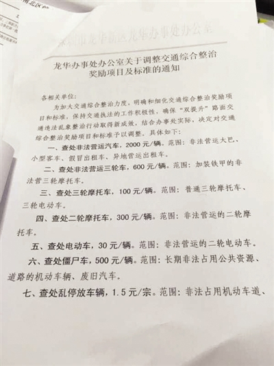 記者在一份由深圳龍華新區(qū)龍華辦事處辦公室出具的《關(guān)于調(diào)整交通綜合整治獎勵項目及標(biāo)準(zhǔn)的通知》的文件中發(fā)現(xiàn),為加大交通綜合整治力度,明確和細(xì)化交通綜合整治獎勵項目和標(biāo)準(zhǔn),保持交通執(zhí)法的工作積極性,辦事處決定對交通綜合整治獎勵項目和標(biāo)準(zhǔn)予以調(diào)整,其中加裝鐵甲的非法營運三輪車每查處一輛獎勵600元,普通三輪摩托車、三輪電動車每輛獎勵100元,對無證駕駛、妨礙執(zhí)法當(dāng)事人實施行政拘留的,拘留一人獎勵500元。