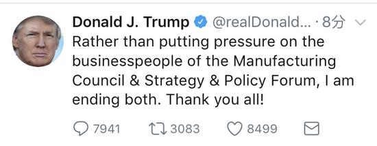 特朗普在推文中寫道:“與其給制造業(yè)顧問委員會和戰(zhàn)略與政策論壇的商人們施加壓力,我倒不如將它們都關(guān)閉,謝謝你們所有人!”