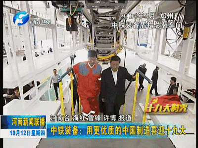 中國(guó)共產(chǎn)黨第十九次全國(guó)代表大會(huì)即將召開,今天起,河南新聞聯(lián)播推出《十九大時(shí)光》專欄,和您一起走進(jìn)革命老區(qū)、田間地頭、工礦企業(yè)、街道社區(qū),傾聽基層干部群眾愛(ài)黨愛(ài)國(guó)的熱切心聲,感受人們建設(shè)出彩中原的火熱場(chǎng)景,聚焦十九大召開的歷史性時(shí)刻,共度這段特殊而又美好的時(shí)光。今天播出第一集《中鐵裝備:用更優(yōu)質(zhì)的中國(guó)制造喜迎十九大》。