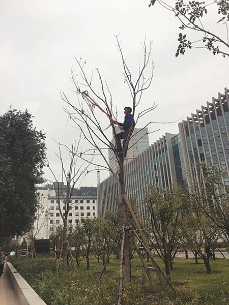 原來(lái),這是剪枝人老段在工作,這一片地方新栽的白蠟樹(shù)要剪掉多余的旁枝,老段必須在入冬前完成所有的剪枝工作。身穿藍(lán)色工作服、頭戴一頂帽子的老段,手里拿著工具,工作時(shí)的動(dòng)作很靈活。