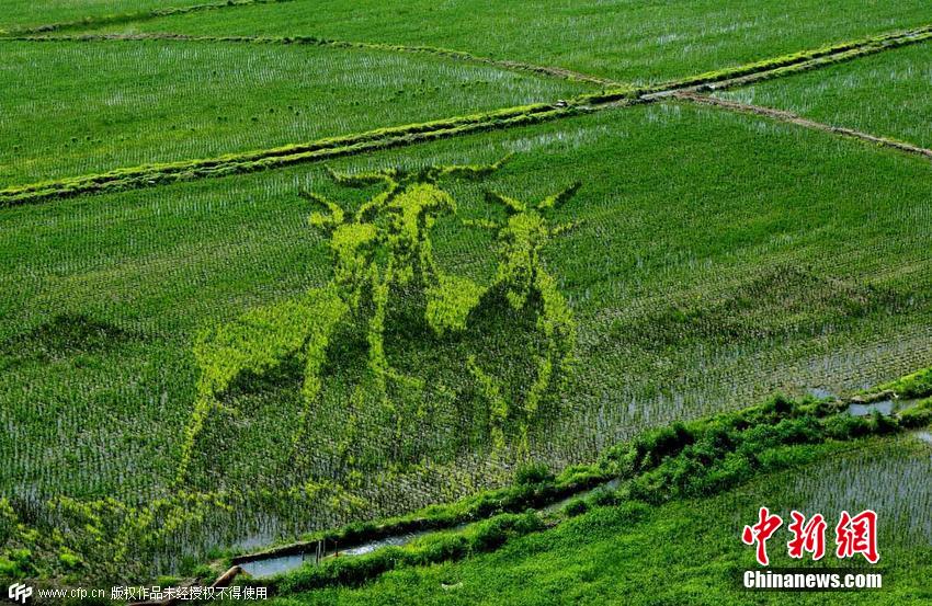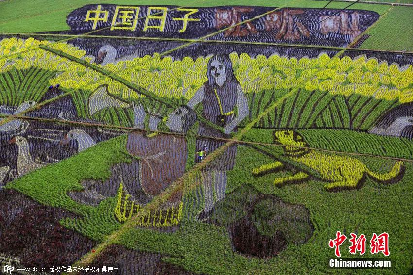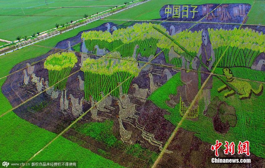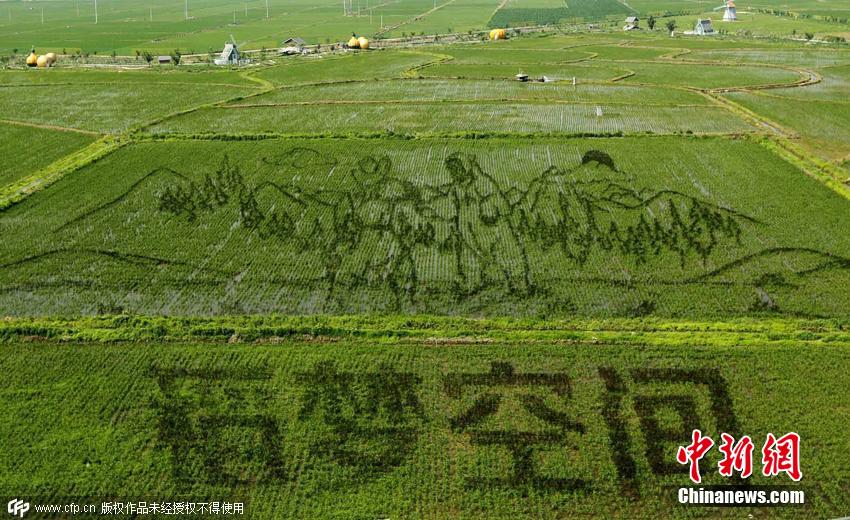 2015年6月22日,遼寧省沈陽市,總占地面積150畝的巨幅稻田畫《中國日子 呱呱叫》、《中國夢 幸福起航》、《小夢露》等十三幅“3D稻田畫”正式亮相沈陽沈北新區(qū)興隆臺錫伯族鎮(zhèn)。據(jù)了解,錫伯族有種植稻田畫祈福的傳統(tǒng),稻田畫先設計好要表現(xiàn)的圖形,利用先進的3D技術和透視技術,用矢量法定點定樁連線人工填色,種植不同品種有著不同顏色葉子的水稻,繪制出平面,立體,嘍空,線條四種不同風格稻田畫。田衛(wèi)濤 攝 圖片來源:CFP視覺中國