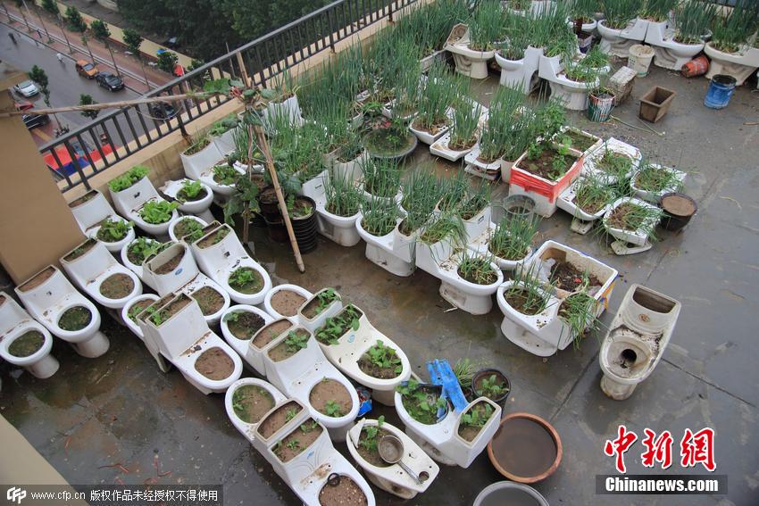 2015年07月16日,山東省菏澤市,在中央公館小區(qū)21號樓樓頂?shù)南榔脚_上,有業(yè)主擺放了數(shù)十個廢棄馬桶,種上了各種蔬菜。還用廢舊沙發(fā)搭起了鴨棚,養(yǎng)起了鴨子。在樓頂?shù)慕锹淅铮浾哌€發(fā)現(xiàn)了一個簡易廁所。該樓居民表示,“菜園”的主人平時就直接使用廁所糞便作為蔬菜的肥料。天氣炎熱時,氣味很大,附近居民苦不堪言。