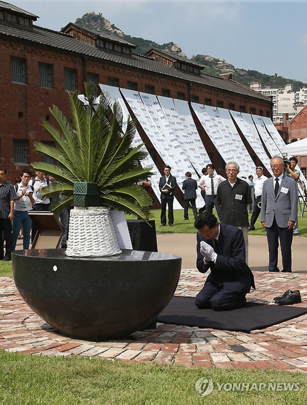 當(dāng)?shù)貢r(shí)間2015年8月12日,正在韓國(guó)訪問(wèn)的日本前首相鳩山由紀(jì)夫參觀了首爾“西大門(mén)刑務(wù)所”博物館,并在追悼碑前跪地禱告。據(jù)悉,西大門(mén)刑務(wù)所始建于1908年,用于關(guān)押反抗日本殖民統(tǒng)治的韓國(guó)抗日義士。鳩山由紀(jì)夫表示,日本理應(yīng)承認(rèn)殖民侵略歷史。(圖片來(lái)源:網(wǎng)絡(luò))