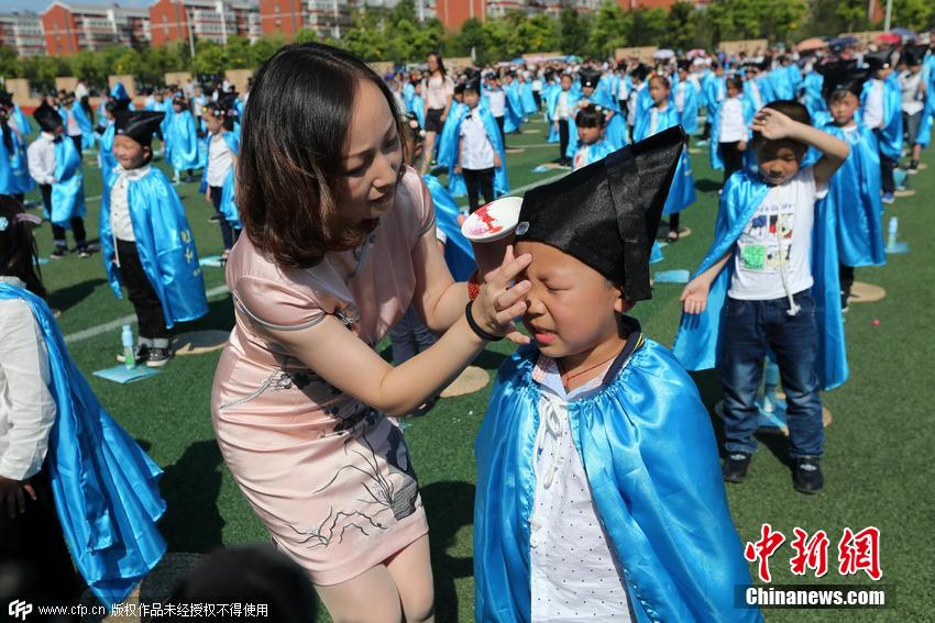 當?shù)貢以谌雽W儀式上為一年級學生“點朱砂啟智”。 圖片來源:CFP視覺中國