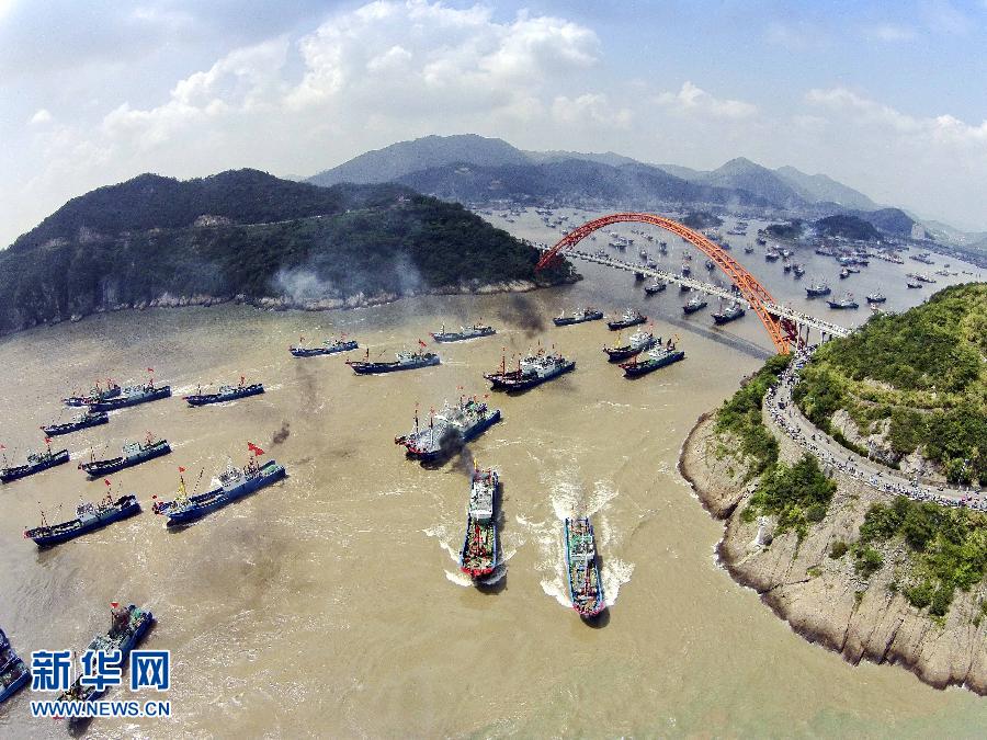 9月16日,浙江省舟山市沈家門漁港的漁船出港經(jīng)過朱家尖大橋開赴漁場。當(dāng)日,為期3個半月的東海伏季休漁結(jié)束,眾多漁船劈波斬浪,開往漁場。 新華社發(fā)(華志波 攝)