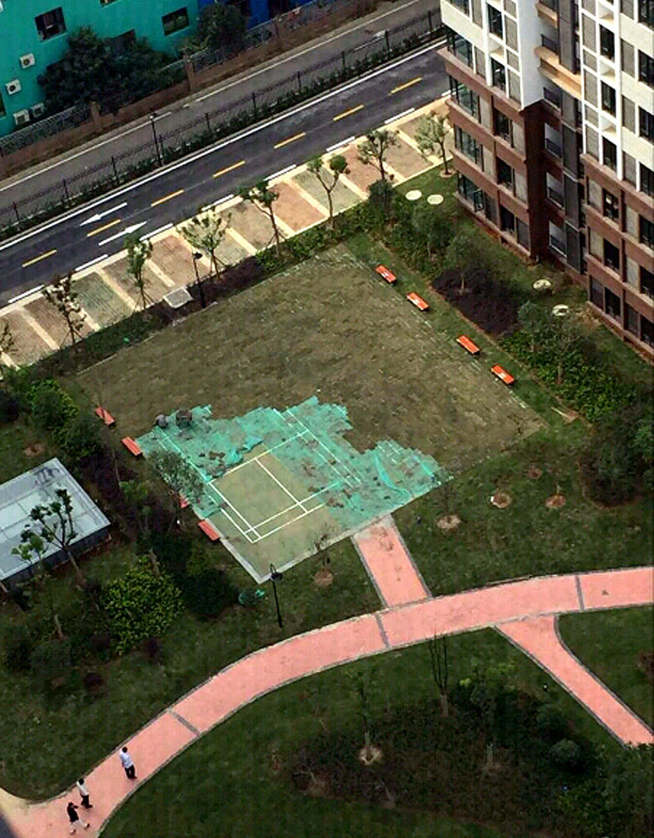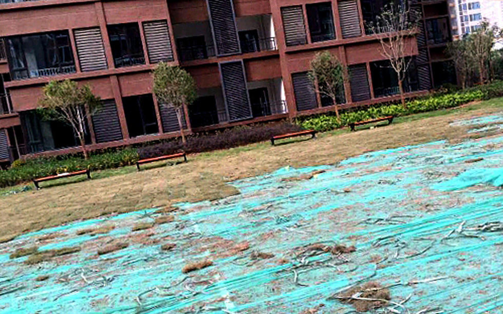 2015年10月12日,湖北武漢市一小區(qū)住宅項(xiàng)目為了通過(guò)綠化部門(mén)驗(yàn)收,開(kāi)發(fā)商可謂煞費(fèi)苦心:在已建好的球場(chǎng)上鋪上草坪,增加綠化率。