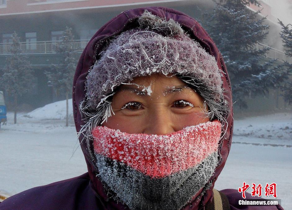 12月26日,內(nèi)蒙古呼倫貝爾,受強(qiáng)冷空氣影響,呼倫貝爾市境內(nèi)各地遭遇極端低溫天氣。圖為當(dāng)日?qǐng)D里河鎮(zhèn)最低氣溫達(dá)-42℃,低溫使市民的臉上瞬間結(jié)滿冰霜。 圖片來(lái)源:視覺中國(guó)