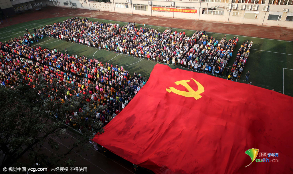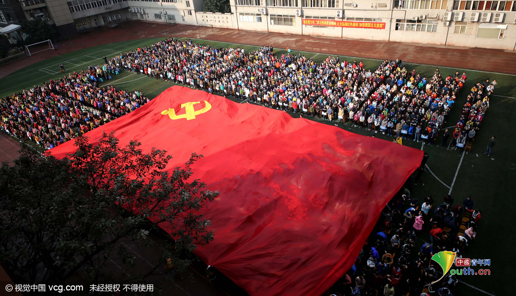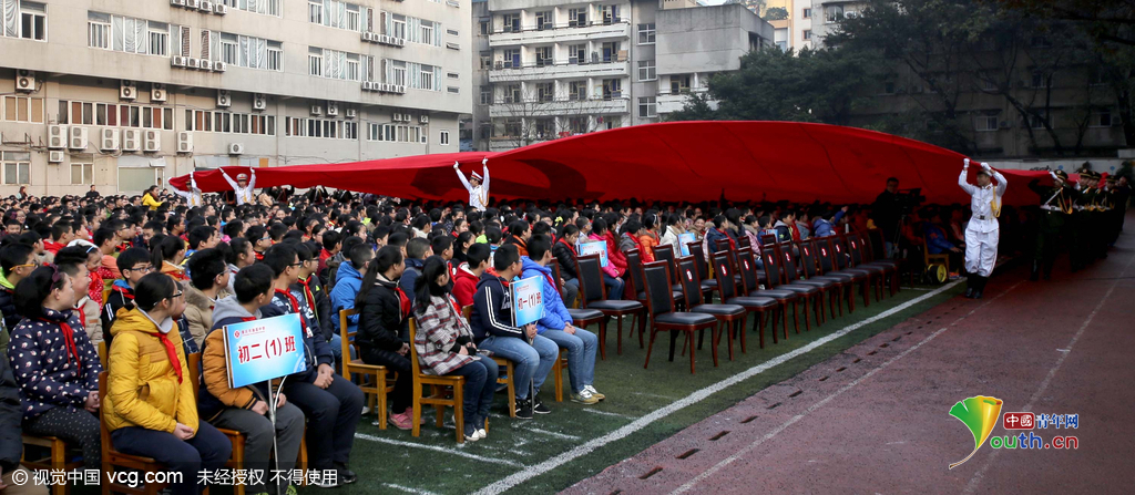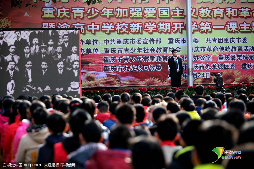 2016年02月24日,重慶市新區(qū),渝高中學(xué),開學(xué)典禮上同學(xué)們傳遞一面90米寬的巨大黨旗。開學(xué)第一課由聶榮臻元帥陳列館報告團(tuán)成員為同學(xué)們宣講老一輩無產(chǎn)階級革命家的豐功偉績。視覺中國