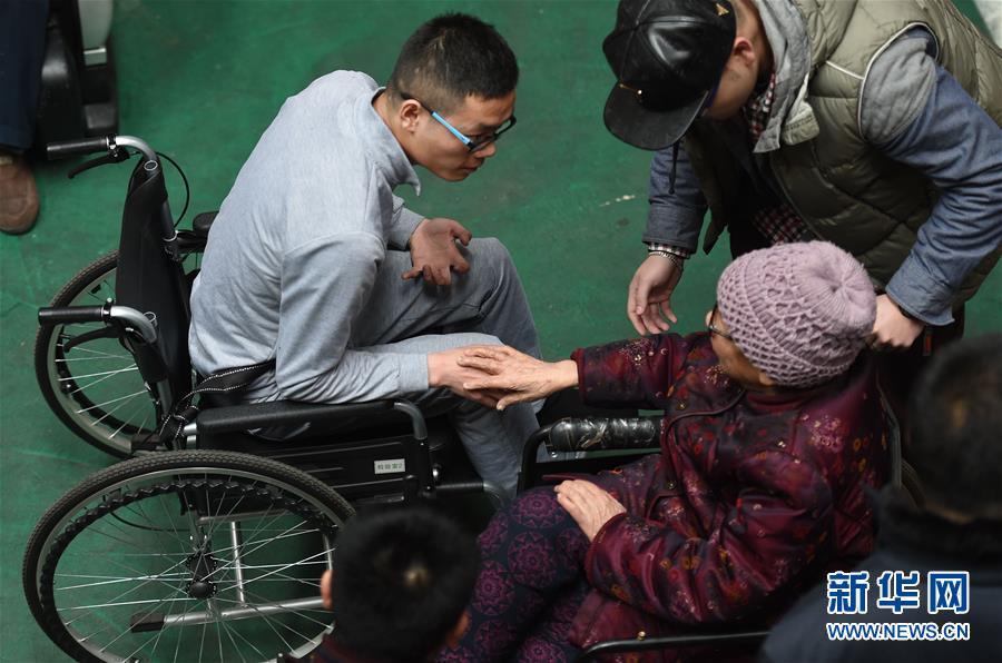 3月17日,奶奶與黃舸扮演者王峰見面后,伸出手準(zhǔn)備觸碰王峰的手,而王峰則保持著模仿肌營(yíng)養(yǎng)不良患者的手型。新華社記者 李尕 攝 圖片來源:新華網(wǎng)