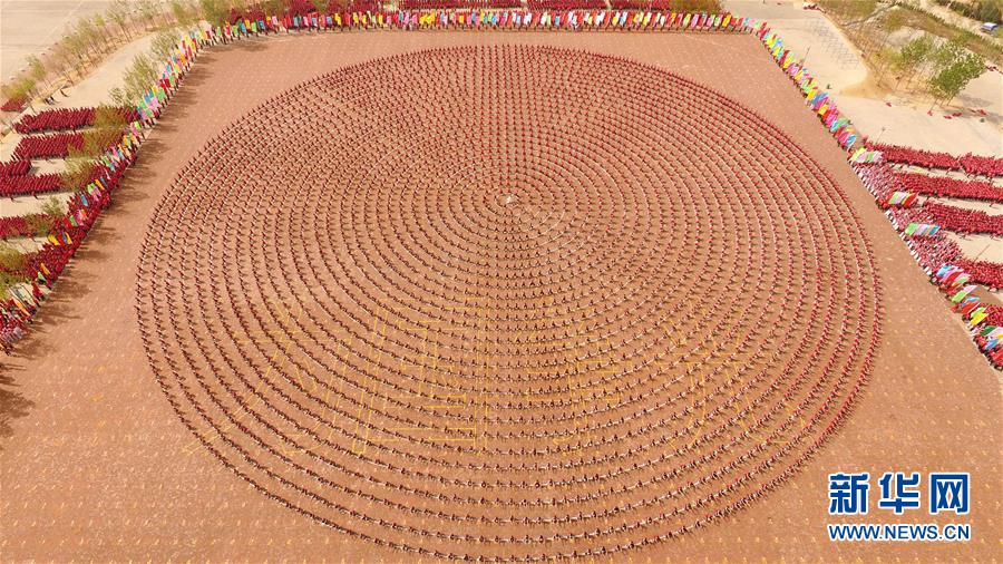4月7日,在河南登封少林塔溝武術(shù)學(xué)校練功場,上課間操的學(xué)員擺出圓形圖案。當(dāng)日,河南登封少林塔溝武術(shù)學(xué)校2016年“春訓(xùn)”拉開帷幕,2.6萬名學(xué)員同上陣,進行隊形變換、十八般兵器、少林硬氣功、少林集體棍等多種功法演練?!按河?xùn)”是少林塔溝武術(shù)學(xué)校每年春季開展的一項強化訓(xùn)練活動,旨在提升學(xué)員的耐力和競技狀態(tài)。新華社發(fā)(牛書培 攝)