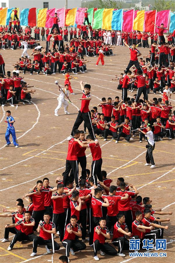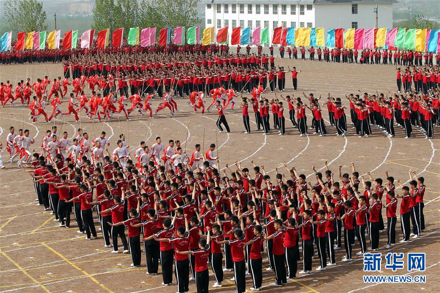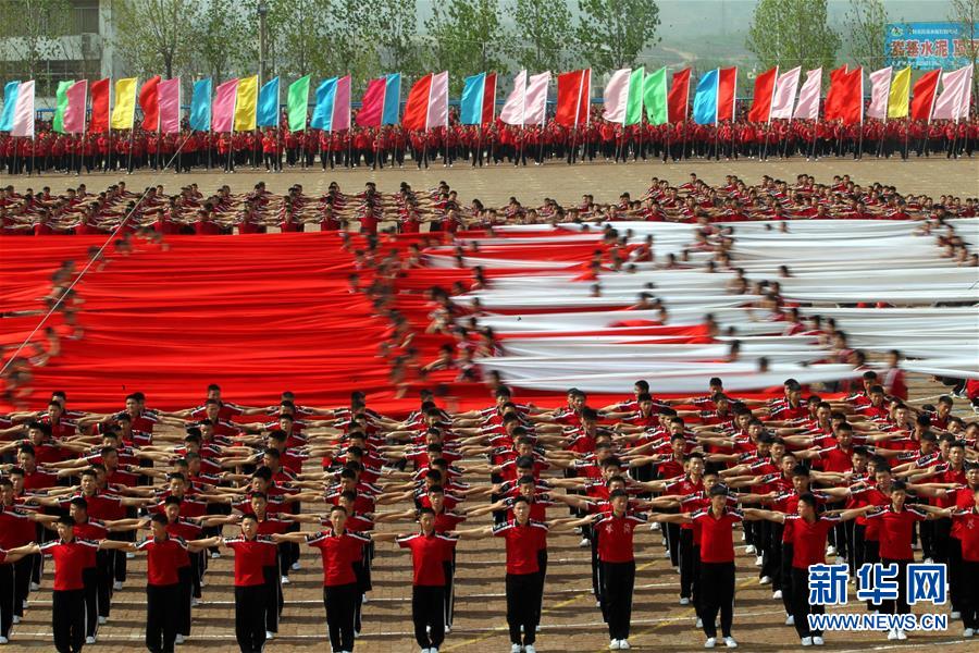 4月7日,在河南登封少林塔溝武術(shù)學(xué)校練功場,上課間操的學(xué)員進行隊形變換。當(dāng)日,河南登封少林塔溝武術(shù)學(xué)校2016年“春訓(xùn)”拉開帷幕,2.6萬名學(xué)員同上陣,進行隊形變換、十八般兵器、少林硬氣功、少林集體棍等多種功法演練?!按河?xùn)”是少林塔溝武術(shù)學(xué)校每年春季開展的一項強化訓(xùn)練活動,旨在提升學(xué)員的耐力和競技狀態(tài)。新華社發(fā)(牛書培 攝)