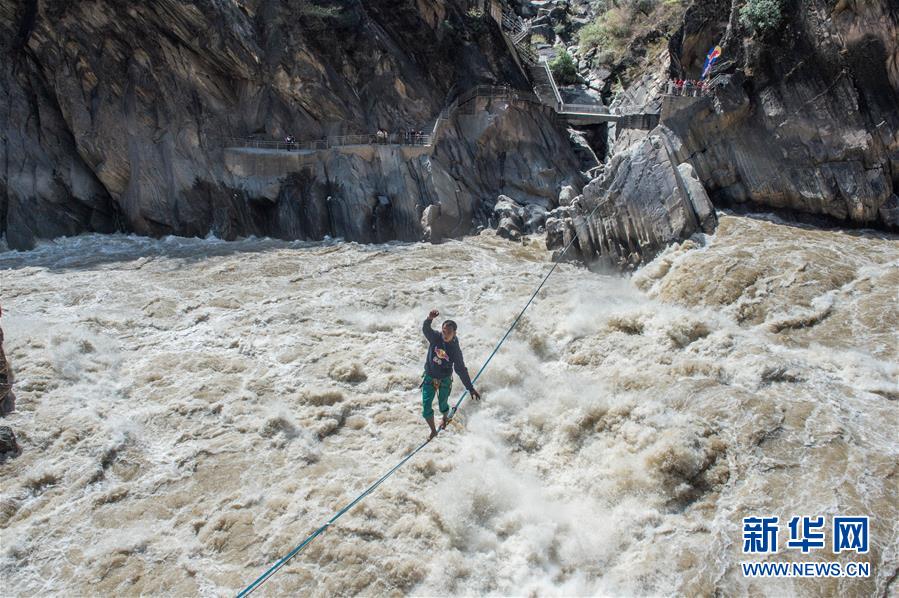 4月26日,張亮在扁帶上行走。當(dāng)日,在云南香格里拉的長(zhǎng)江天險(xiǎn)虎跳峽上,“中國(guó)扁帶第一人”張亮利用寬度只有2.5厘米的扁帶,在距離江面16米的高度上成功行走60米,耗時(shí)5分58秒抵達(dá)虎跳峽香格里拉一側(cè)的終點(diǎn)完成挑戰(zhàn)。