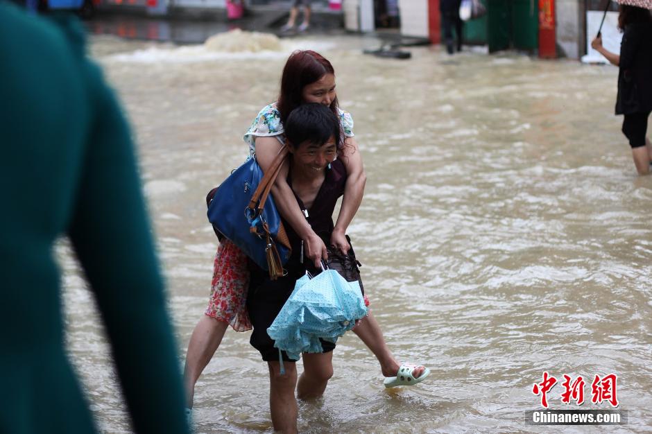5月5日,地處湘南的永州市道縣遭遇暴風(fēng)雨襲擊,縣城內(nèi)多處低洼路段被水淹沒。當(dāng)?shù)胤姥床块T正嚴(yán)密監(jiān)控雨情、水情,確保安全度汛。圖為市民趟水出行。 中新社發(fā) 何紅福 攝
