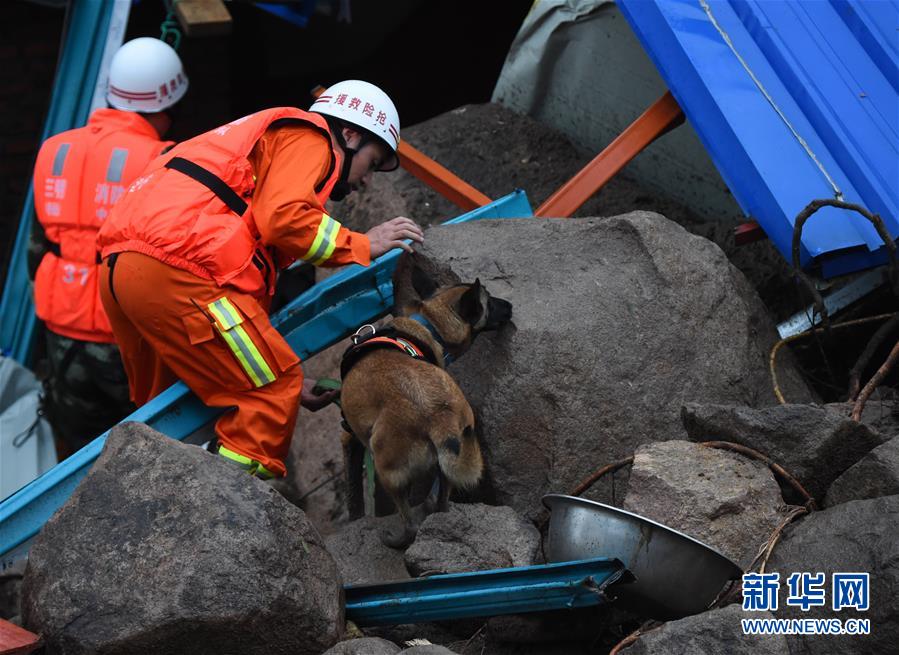 5月8日,消防人員利用搜救犬在現(xiàn)場(chǎng)尋找生命跡象。