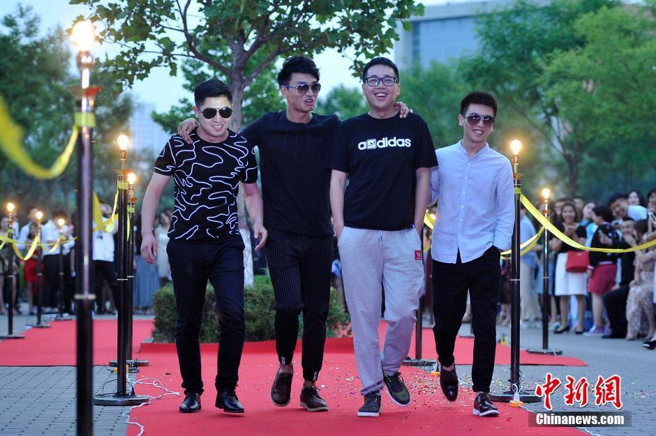 6月3日晚,山西大學(xué)美術(shù)學(xué)院畢業(yè)典禮,大學(xué)畢業(yè)生通過(guò)紅地毯走進(jìn)會(huì)場(chǎng),學(xué)弟學(xué)妹們夾道歡迎。當(dāng)畢業(yè)生情侶一起走秀時(shí),引起學(xué)弟學(xué)妹們一陣尖叫。韋亮 攝