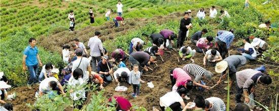昨天,記者驅(qū)車來(lái)到了這個(gè)幾乎是磐安縣最東面的偏遠(yuǎn)鄉(xiāng)鎮(zhèn)胡宅,事實(shí)上,后張村就處于磐安和新昌交界的地方。中午時(shí)候,這個(gè)人口上千的村落幾乎已經(jīng)被各種各樣的車子停滿了,有奔馳越野車,也有面包車和電瓶車,有浙G、浙D、浙A等省內(nèi)牌照的,也有皖N的。這里的山頭傳說(shuō)是死火山形成,所以土壤肥沃,幾乎整塊都被犁出來(lái),種上莊稼,最多的是茶樹。一眼望去,尋寶的人員估計(jì)有六七百人,有人在挖,也有人是在圍觀。村民說(shuō),來(lái)來(lái)回回,當(dāng)天起碼涌進(jìn)來(lái)上千人在尋寶。