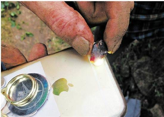 記者在現(xiàn)場(chǎng)看到,有人挖出五六顆還沒(méi)有指甲片大的小石頭,在手機(jī)燈下照了照,就被一女子以400元的價(jià)格買走。47歲的潘熙浩是磐安縣尖山鎮(zhèn)烏石村人,他是早上10點(diǎn)來(lái)的,兩三個(gè)小時(shí)的時(shí)間里,找到了兩顆指甲蓋大的石頭。