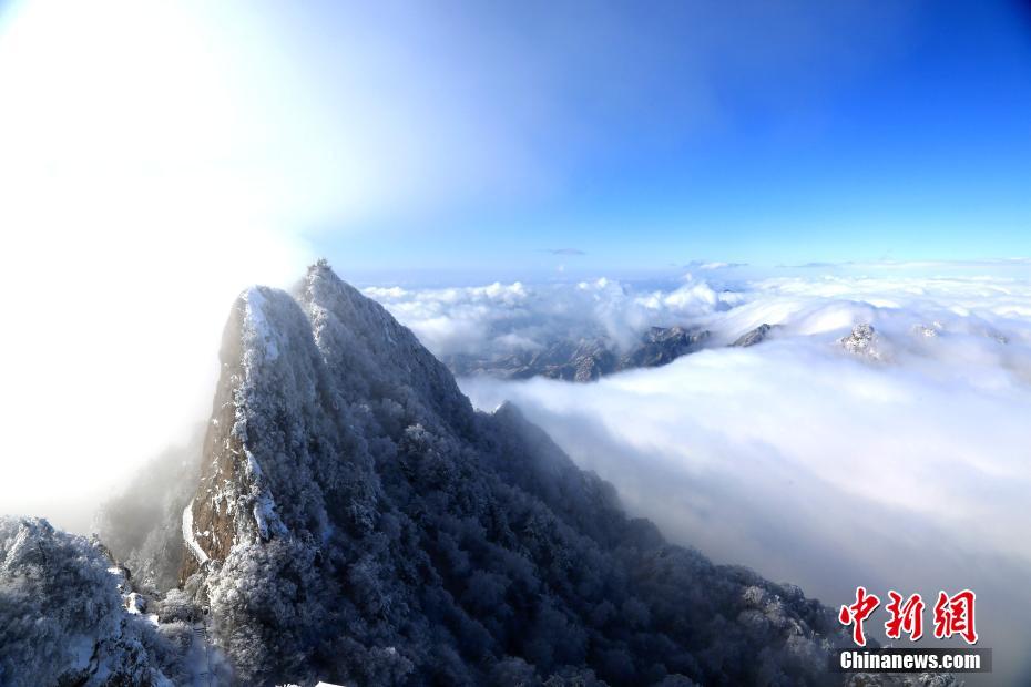 1月7日,連續(xù)降雪之后,位于河南洛陽(yáng)的道教圣地老君山雪后初晴,海拔2000米的伏牛山主峰上,白雪皚皚、銀裝素裹,加之云海浮現(xiàn)與藍(lán)天白云交相輝映,絕壁道觀似瓊樓玉宇幻如仙境美不勝收。圖為云海流過(guò)山間。王中舉 攝