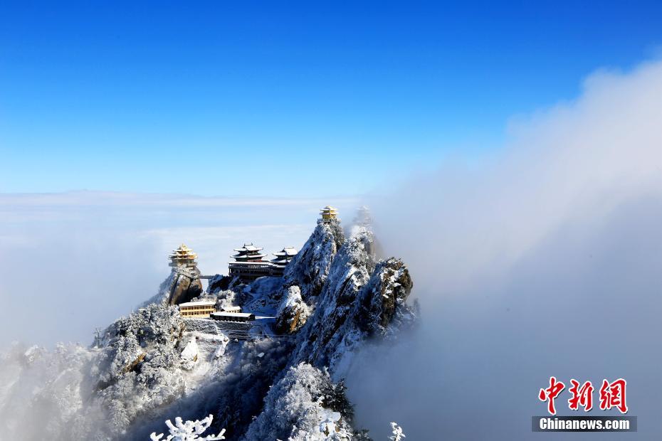1月7日,連續(xù)降雪之后,位于河南洛陽(yáng)的道教圣地老君山雪后初晴,海拔2000米的伏牛山主峰上,白雪皚皚、銀裝素裹,加之云海浮現(xiàn)與藍(lán)天白云交相輝映,絕壁道觀似瓊樓玉宇幻如仙境美不勝收。 圖為海拔2000米的絕壁道觀幻如仙境。王中舉 攝