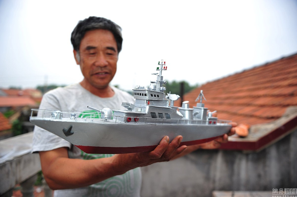 郭長(zhǎng)海,初小文化,當(dāng)過27年的船長(zhǎng)。2005年,迫于海洋漁業(yè)的枯竭,他將漁船賣掉。但是仍然割舍不了對(duì)大海的依戀之情。平時(shí),他喜歡從電視上了解國家大事,最愛看軍事頻道,耳濡目染,于是對(duì)軍艦產(chǎn)生了濃厚的興趣。農(nóng)閑的時(shí)候,郭長(zhǎng)海便琢磨起了艦艇模型的制作。