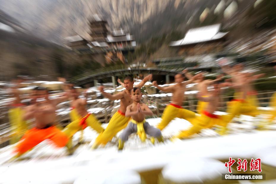 2月22日,河南出現(xiàn)暴雪天氣,氣溫驟降,少林寺所在地登封嵩山白雪茫茫,銀裝素裹,武僧們赤膊上身在冰天雪地里苦練少林功夫。盡管寒風(fēng)刺骨,少林武僧們依舊照常練功,只見(jiàn)他們赤膊上陣,不懼寒冷,在雪窩里扎馬步、練少林棍、刀槍對(duì)戰(zhàn)。他們中間最小的只有6歲。 中新社記者 王中舉 攝