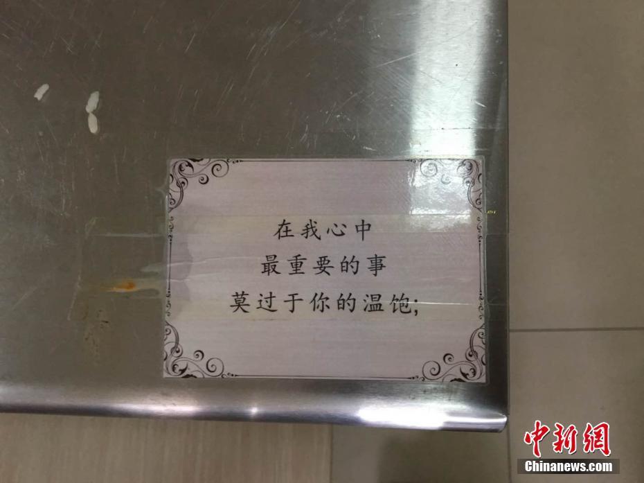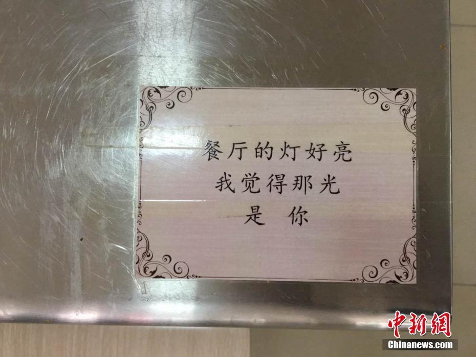 “這些情詩是開學(xué)前貼上的,剛開始只是想讓餐廳更個(gè)性化一點(diǎn)?!钡聦氹拚f,很多人覺得食堂就是個(gè)做大鍋菜的地方,吃飽肚子就行?!拔蚁爰右稽c(diǎn)不一樣的元素,就發(fā)動(dòng)朋友收集和吃飯有關(guān)的三行情書。”燕武 阿琳娜 攝影報(bào)道